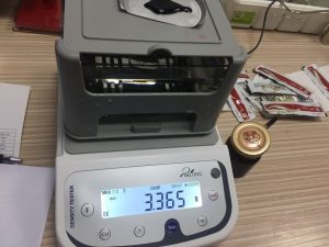 • 將2號(hào)阿膠膏體液置于稱(chēng)重臺(tái)上,屏幕出現(xiàn)空氣中阿膠液的重量為3.365,按MODE鍵,就記錄了阿膠液在空氣中的重量了。