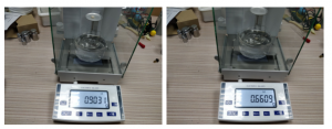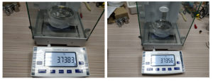 • 重復剛才的步驟擦拭干剛才測的2號陶瓷材料,確保不沾有一點水。把陶瓷材料放在稱重架上,重復前面兩個操作步驟。得出以下的測量結果。