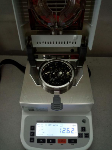 - 為了得到更精確穩(wěn)定的數(shù)據(jù)結(jié)果,在進行第二次測試過程前先等待種子水分儀降溫,待水分儀本身冷卻至40度以下時,同樣取5克種子顆粒于不銹鋼托盤中,將種子顆粒平鋪均勻,這次我們把溫度設(shè)定在135℃,按“START”鍵開始測試,18分54秒后檢測結(jié)束,檢測數(shù)據(jù)顯示12.62%;