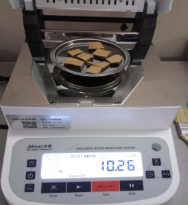 測試樣品:剪取2克紙皮,置于不銹鋼托盤中,將紙皮平鋪均勻,溫度設(shè)置120℃用儀器進行加熱,約5分鐘后檢測結(jié)束,檢測數(shù)據(jù)顯示10.26%;